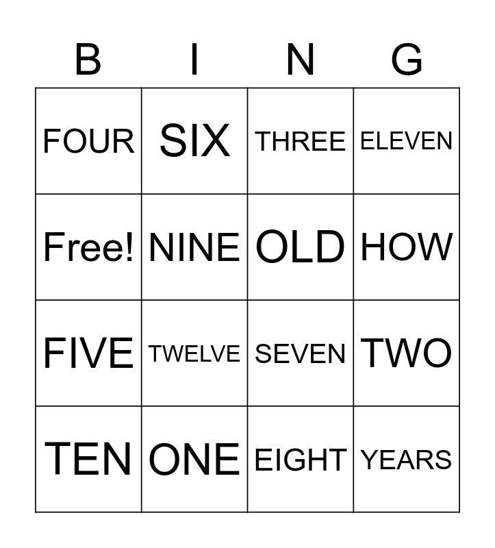 This bingo card has 16 words: ONE, TWO, THREE, FOUR, FIVE, SIX, SEVEN, EIGHT, Free!, NINE, TEN, ELEVEN, TWELVE, HOW, OLD and YEARS.