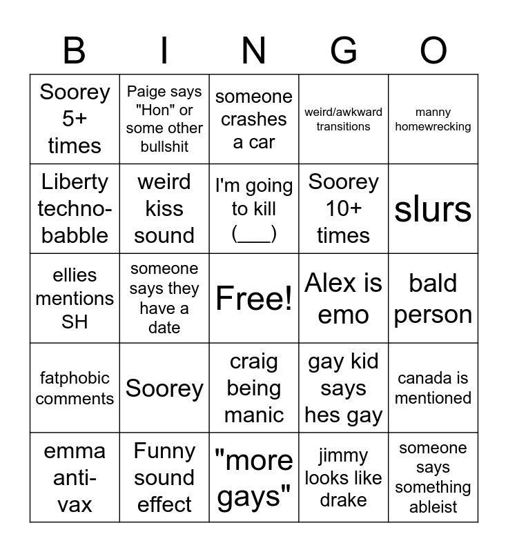 This bingo card has a free space and 24 words: Soorey, Funny sound effect, I'm going to kill (___), emma anti-vax, manny homewrecking, Soorey 5+ times, Liberty techno-babble, Paige says "Hon" or some other bullshit, Alex is emo, craig being manic, Soorey 10+ times, ellies mentions SH, gay kid says hes gay, canada is mentioned, weird kiss sound, jimmy looks like drake, bald person, someone crashes a car, slurs, someone says they have a date, someone says something ableist, fatphobic comments, weird/awkward transitions and "more gays".
