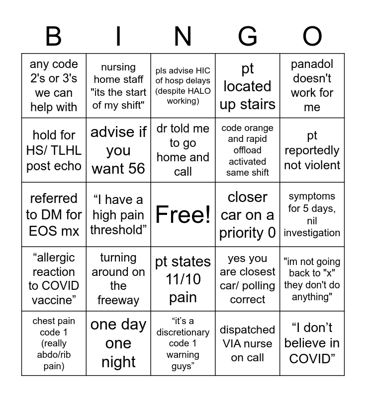 This bingo card has a free space and 24 words: turning around on the freeway, one day one night, dr told me to go home and call, chest pain code 1 (really abdo/rib pain), panadol doesn't work for me, any code 2's or 3's we can help with, hold for HS/ TLHL post echo, nursing home staff "its the start of my shift", closer car on a priority 0, pt states 11/10 pain, code orange and rapid offload activated same shift, referred to DM for EOS mx, yes you are closest car/ polling correct, "im not going back to "x" they don't do anything", advise if you want 56, dispatched VIA nurse on call, symptoms for 5 days, nil investigation, pls advise HIC of hosp delays (despite HALO working), pt reportedly not violent, “I have a high pain threshold”, “I don’t believe in COVID”, “allergic reaction to COVID vaccine”, pt located up stairs and “it’s a discretionary code 1 warning guys”.