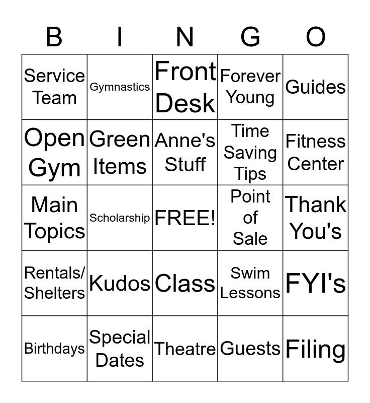 This bingo card has a free space and 24 words: Kudos, Special Dates, Anne's Stuff, Birthdays, Guides, Service Team, Open Gym, Gymnastics, Point of Sale, Class, Time Saving Tips, Main Topics, Swim Lessons, FYI's, Green Items, Guests, Thank You's, Front Desk, Fitness Center, Scholarship, Filing, Rentals/ Shelters, Forever Young and Theatre.