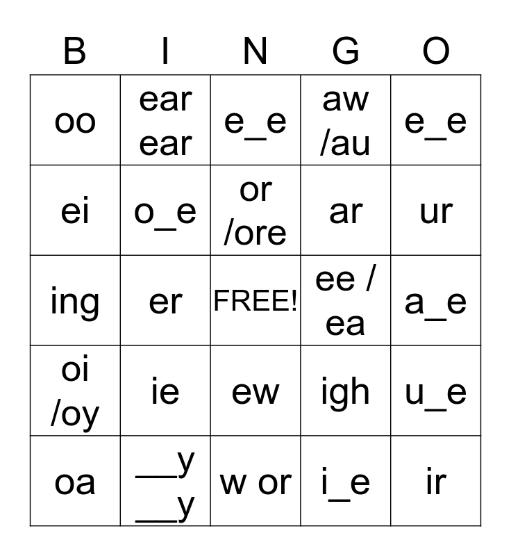This bingo card has a free space and 24 words: ie, __y __y, or /ore, oa, e_e, oo, ei, ear ear, ee / ea, ew, ar, ing, igh, u_e, o_e, i_e, a_e, e_e, ur, er, ir, oi /oy, aw /au and w or.