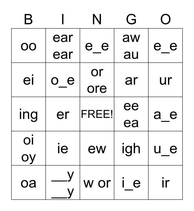 This bingo card has a free space and 24 words: ie, __y __y, or ore, oa, e_e, oo, ei, ear ear, ee ea, ew, ar, ing, igh, u_e, o_e, i_e, a_e, e_e, ur, er, ir, oi oy, aw au and w or.