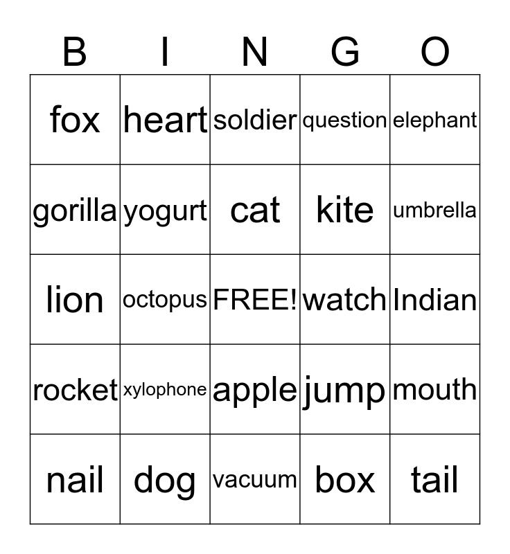 This bingo card has a free space and 26 words: apple, box, cat, dog, elephant, fox, gorilla, heart, Indian, jump, kite, lion, mouth, nail, octopus, piano, question, rocket, soldier, tail, umbrella, vacuum, watch, xylophone, yogurt and zebra.