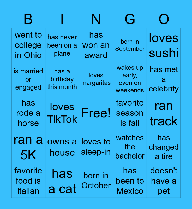 This bingo card has a free space and 24 words: owns a house, has a cat, loves margaritas, favorite food is italian, loves sushi, went to college in Ohio, is married or engaged, has never been on a plane, favorite season is fall, loves to sleep-in, wakes up early, even on weekends, has rode a horse, watches the bachelor, has changed a tire, has a birthday this month, has been to Mexico, ran track, has won an award, has met a celebrity, loves TikTok, doesn't have a pet, ran a 5K, born in September and born in October.