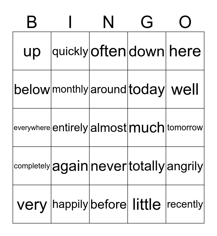 This bingo card has 35 words: always, daily, hourly, monthly, never, down, below, away, around, above, everywhere, here, inside, outside, up, much, little, entirely, completely, almost, totally, very, angrily, happily, often, well, recently, soon, today, tomorrow, yesterday, before, again, quickly and loudly.