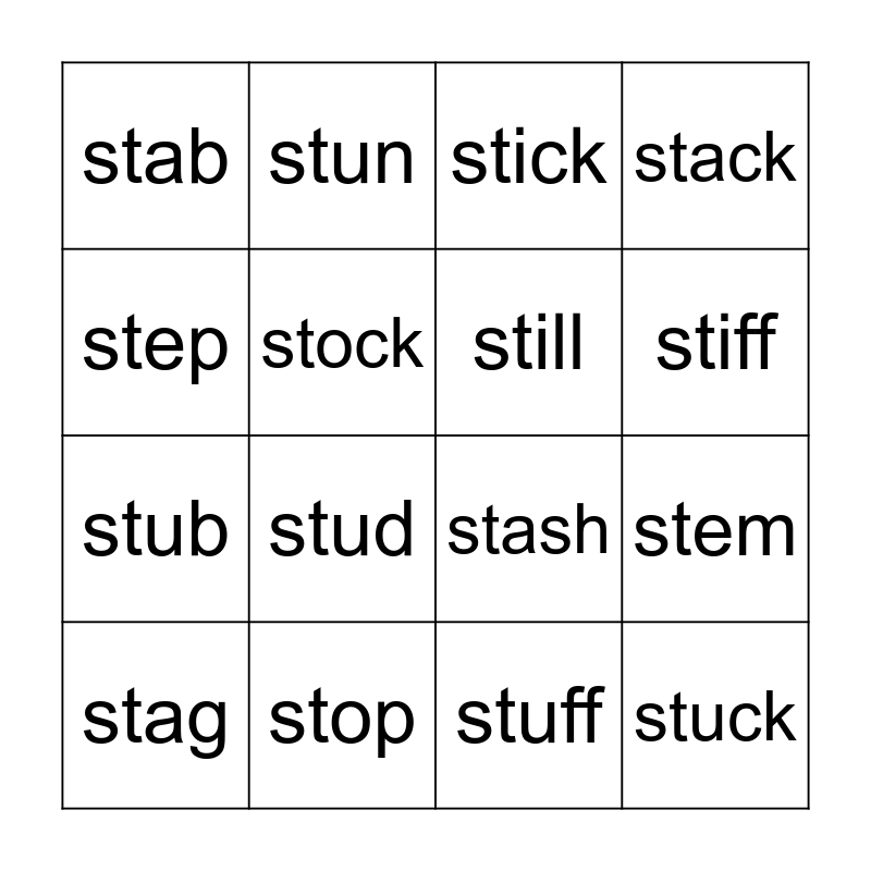This bingo card has 16 words: stop, stem, stick, stab, stub, stun, stash, stuff, step, stock, stag, stack, stud, stiff, still and stuck.