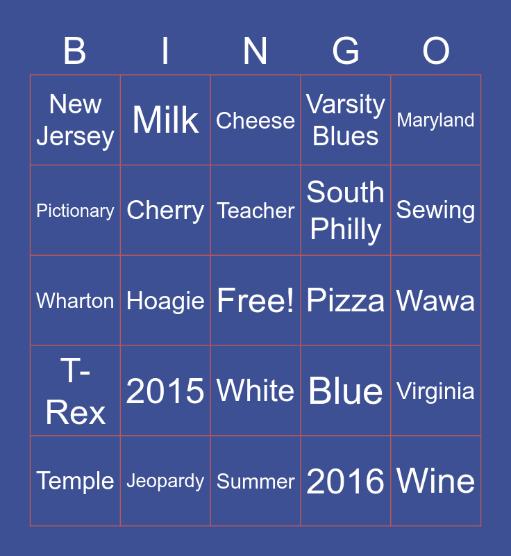 This bingo card has a free space and 24 words: 2015, Jeopardy, Teacher, Temple, Maryland, New Jersey, Pictionary, Milk, Pizza, White, South Philly, Wharton, Blue, Virginia, Cherry, 2016, Wawa, Cheese, Sewing, Hoagie, Wine, T-Rex, Varsity Blues and Summer.