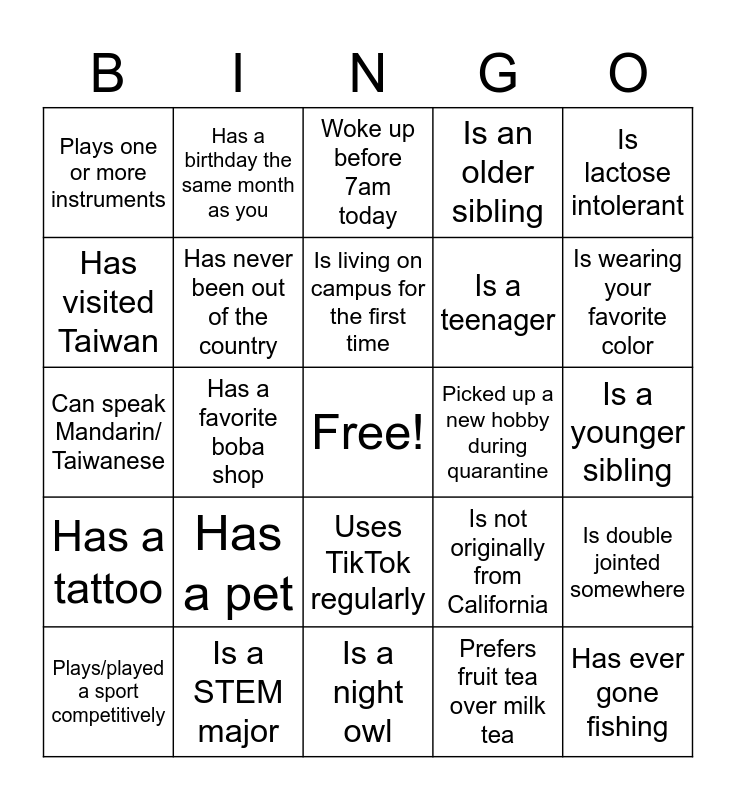 This bingo card has a free space and 24 words: Has a pet, Is a STEM major, Is living on campus for the first time, Plays/played a sport competitively, Is lactose intolerant, Plays one or more instruments, Has visited Taiwan, Has a birthday the same month as you, Picked up a new hobby during quarantine, Uses TikTok regularly, Is a teenager, Can speak Mandarin/ Taiwanese, Is not originally from California, Is double jointed somewhere, Has never been out of the country, Prefers fruit tea over milk tea, Is a younger sibling, Woke up before 7am today, Is wearing your favorite color, Has a favorite boba shop, Has ever gone fishing, Has a tattoo, Is an older sibling and Is a night owl.