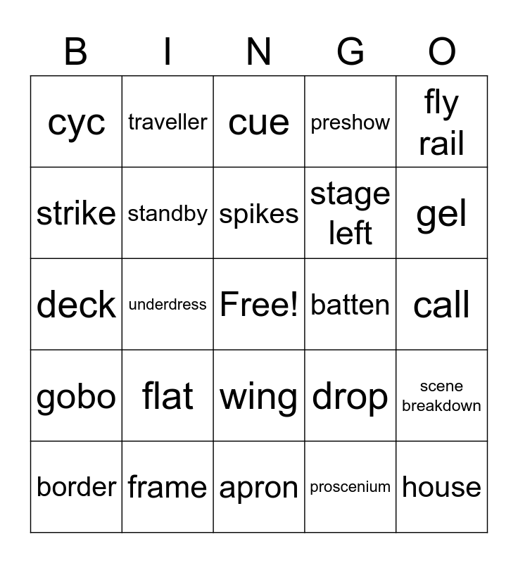 This bingo card has a free space and 34 words: legs, proscenium, pit, fresnel, gobo, standby, fly rail, border, traveller, main, spikes, cue, par can, paper tech, batten, gel, frame, deck, flat, drop, wing, FOH, cyc, call, apron, house, preshow, upstage, stage left, strike, quick change, underdress, scene breakdown and mic tape.
