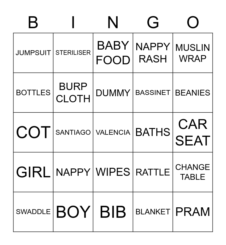 This bingo card has 25 words: NAPPY, BIB, DUMMY, SWADDLE, MUSLIN WRAP, JUMPSUIT, BOTTLES, STERILISER, BATHS, WIPES, BASSINET, COT, RATTLE, CHANGE TABLE, BURP CLOTH, PRAM, CAR SEAT, BABY FOOD, BEANIES, SANTIAGO, VALENCIA, BOY, GIRL, NAPPY RASH and BLANKET.