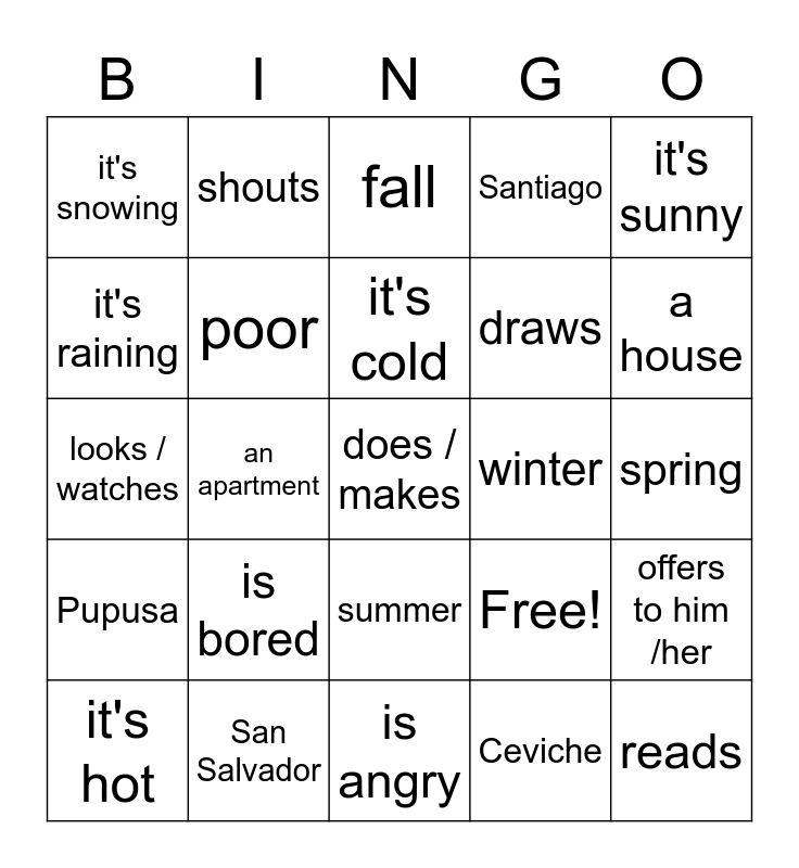 This bingo card has 25 words: is bored, is angry, it's cold, it's hot, it's sunny, it's snowing, it's raining, shouts, winter, summer, draws, looks / watches, Free!, offers to him /her, poor, reads, spring, fall, a house, an apartment, does / makes, San Salvador, Pupusa, Santiago and Ceviche.