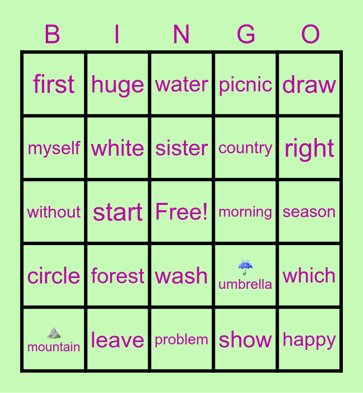 This bingo card has a free space and 24 words: forest, leave, sister, ⛰ mountain, draw, first, myself, huge, morning, wash, country, without, ☔ umbrella, which, white, show, season, water, right, start, happy, circle, picnic and problem.