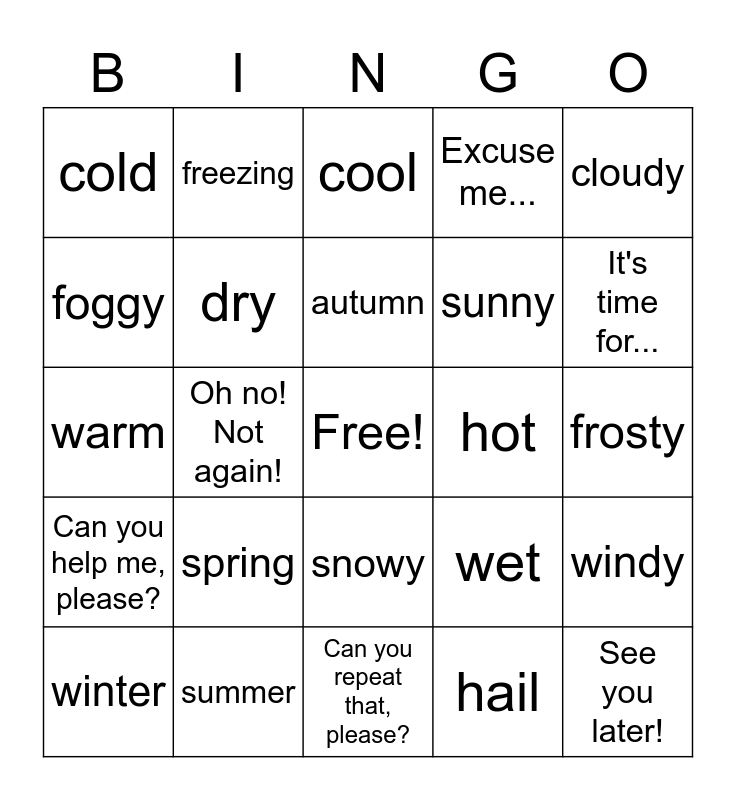 This bingo card has a free space and 24 words: spring, summer, autumn, winter, cloudy, cold, foggy, freezing, hot, snowy, sunny, warm, wet, windy, dry, hail, frosty, cool, It's time for..., Oh no! Not again!, See you later!, Can you help me, please?, Excuse me... and Can you repeat that, please?.