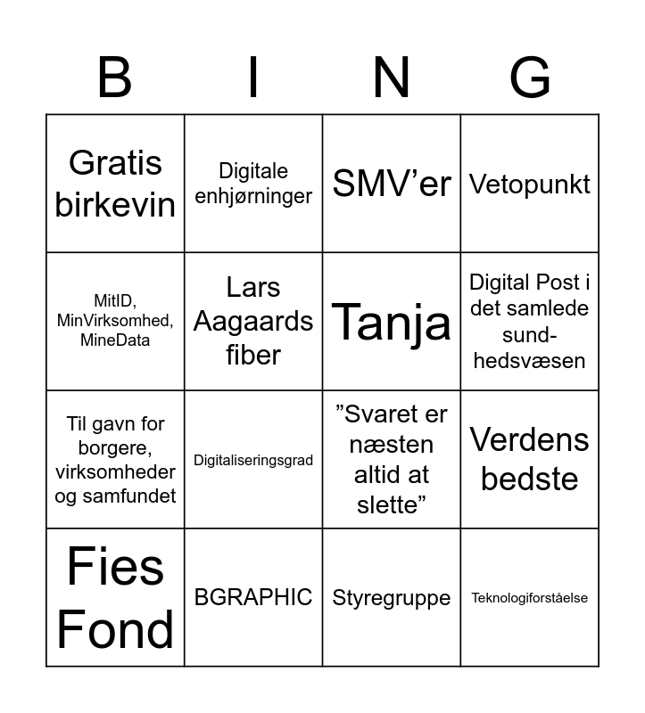 This bingo card has 51 words: Free!, Fies Fond, André, Salatrobot, Fælles Investerings Environment Fond (FIE), Flagskibe, Digitale enhjørninger, Data space, Lars Aagaards fiber, Korrektur, Tanja, Vetopunkt, Vækst og eksport, Kompetencer, Datapapiret, Den parkerings- og ladesøgende trafik, Digital Post i det samlede sund-hedsvæsen, BGRAPHIC, ABBA, MitID, MinVirksomhed, MineData, Verdens bedste, Visioner, Gratis birkevin, Til gavn for borgere, virksomheder og samfundet, Ansvarlighed, Statusmøder, Digitaliseringsgrad, Anbefalinger, Digitaliseringsråd, SMV’er, Robotbibliotek, Konsulentstop, konsulentbesparel-ser, konsulenttilbageholdenhed, Forplejningssagen, UM i indfak, Genbrugelige byggeblokke, Vækst og velfærd, Samtykkeportal, Parallelle processer, Wake me up when September ends, Digitaliseringsenheden, Styregruppe, Teknologiforståelse, Afrapportering, Overdreven forsigtighed, Kraftigt stigende cybertrussel, Fundament, ”Svaret er næsten altid at slette”, ”Det bliver kun dårligere nu”, Mobilmaster, fiber og bredbånd, Først og bedst and GAIA-X.