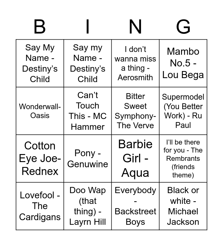 This bingo card has 17 words: Everybody - Backstreet Boys, Lovefool - The Cardigans, I don’t wanna miss a thing - Aerosmith, Say My Name - Destiny’s Child, Pony - Genuwine, Mambo No.5 - Lou Bega, I’ll be there for you - The Rembrants (friends theme), Bitter Sweet Symphony- The Verve, Supermodel (You Better Work) - Ru Paul, Can’t Touch This - MC Hammer, Doo Wap (that thing) - Layrn Hill, Barbie Girl - Aqua, Wonderwall- Oasis, Say my Name - Destiny’s Child, Cotton Eye Joe- Rednex, Macarena - Los Del Rio and Black or white - Michael Jackson.