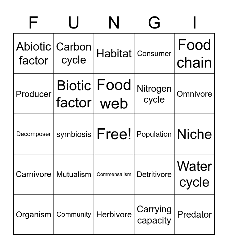 This bingo card has a free space and 29 words: Organism, limiting factor, symbiosis, Parasitism, Abiotic factor, Habitat, Biotic factor, Mutualism, Population, Community, Niche, Predator, Herbivore, Carrying capacity, Omnivore, Prey, Commensalism, Carnivore, Food chain, Decomposer, Detritivore, Ecosystem, Nitrogen cycle, Producer, Consumer, Carbon cycle, Water cycle, Food web and Energy pyramid.