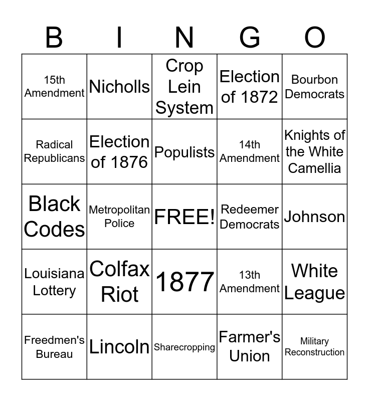 This bingo card has a free space and 24 words: Colfax Riot, Lincoln, Populists, Freedmen's Bureau, Bourbon Democrats, 15th Amendment, Radical Republicans, Nicholls, Redeemer Democrats, 1877, 14th Amendment, Black Codes, 13th Amendment, White League, Election of 1876, Farmer's Union, Johnson, Crop Lein System, Knights of the White Camellia, Metropolitan Police, Military Reconstruction, Louisiana Lottery, Election of 1872 and Sharecropping.