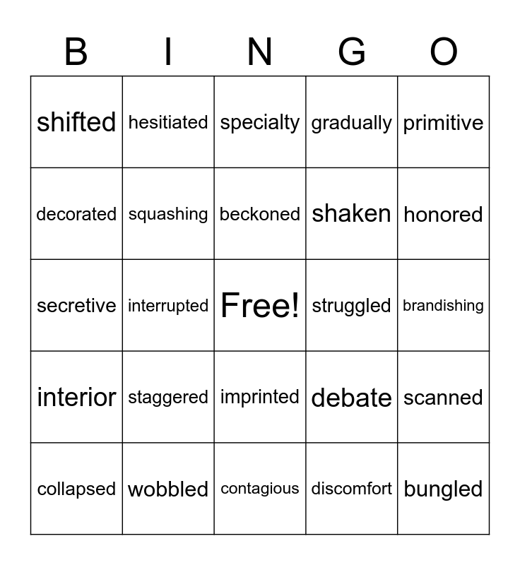 This bingo card has a free space and 29 words: collapsed, disturbing, interrupted, numb, shifted, specialty, squashing, staggered, struggled, wobbled, brandishing, bungled, contagious, discomfort, honored, immersed, imprinted, interior, primitive, secretive, debate, inflated, shaken, decorated, gradually, hesitiated, scanned, beckoned and stalled.
