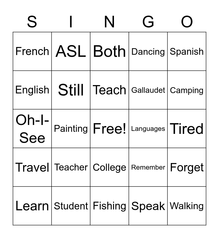 This bingo card has a free space and 24 words: Teacher, Student, Teach, Learn, Spanish, French, English, ASL, Languages, College, Gallaudet, Oh-I-See, Remember, Forget, Still, Speak, Tired, Both, Camping, Painting, Walking, Travel, Dancing and Fishing.