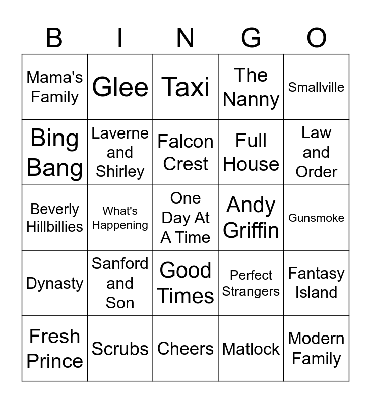 This bingo card has a free space and 31 words: Cheers, Simpsons, What's Happening, Dawson's Creek, Mama's Family, Taxi, Laverne and Shirley, Perfect Strangers, Andy Griffin, Matlock, Gunsmoke, Modern Family, That 70's Show, Mary Tyler Moore, Law and Order, Growing Pains, Fantasy Island, Sanford and Son, Dynasty, Good Times, Smallville, Honey Mooners, Fresh Prince, Glee, Full House, Bing Bang, The Nanny, Beverly Hillbillies, Scrubs, Falcon Crest and Dallas.