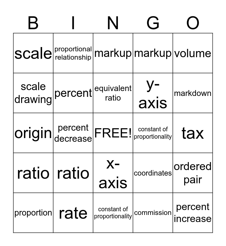 This bingo card has a free space and 24 words: ratio, rate, equivalent ratio, proportion, volume, scale, scale drawing, proportional relationship, constant of proportionality, x-axis, y-axis, origin, coordinates, ordered pair, percent, commission, tax, markup, markdown, percent decrease, percent increase, ratio, markup and constant of proportionality.