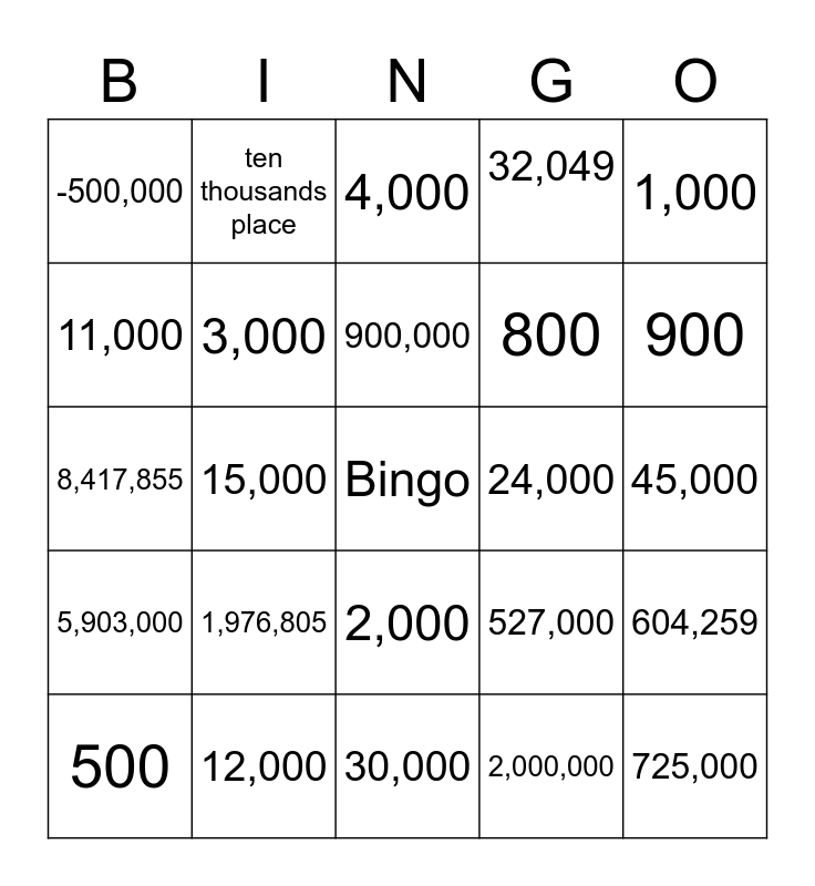 This bingo card has a free space and 24 words: 1,976,805, 12,000, 900,000, 500, 1,000, -500,000, 11,000, ten thousands place, 24,000, 2,000, 800, 8,417,855, 527,000, 604,259, 3,000, 2,000,000, 45,000, 4,000, 900, 15,000, 725,000, 5,903,000, 32,049 and 30,000.