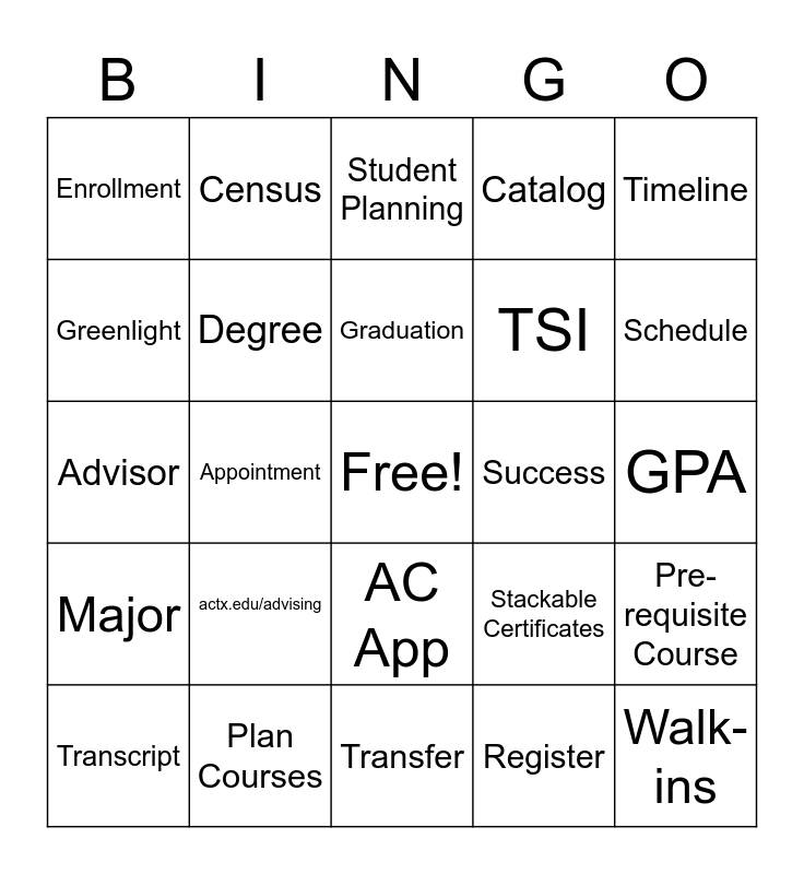This bingo card has a free space and 24 words: actx.edu/advising, Plan Courses, Graduation, Transcript, Timeline, Enrollment, Greenlight, Census, Success, AC App, TSI, Advisor, Stackable Certificates, Pre-requisite Course, Degree, Register, GPA, Student Planning, Schedule, Appointment, Walk-ins, Major, Catalog and Transfer.