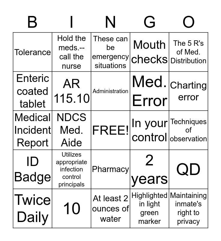 This bingo card has a free space and 24 words: Utilizes appropriate infection control principals, 10, Administration, Twice Daily, The 5 R's of Med. Distribution, Tolerance, Enteric coated tablet, Hold the meds.--call the nurse, In your control, Pharmacy, Med. Error, Medical Incident Report, 2 years, QD, AR 115.10, Highlighted in light green marker, Techniques of observation, These can be emergency situations, Charting error, NDCS Med. Aide, Maintaining inmate's right to privacy, ID Badge, Mouth checks and At least 2 ounces of water.