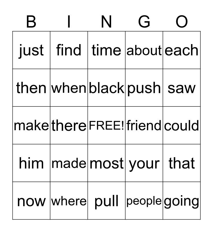 This bingo card has a free space and 35 words: from, may, once, when, most, about, then, call, black, come, make, each, would, more, just, friend, people, there, him, going, your, now, that, where, time, saw, very, off, push, could, yellow, pull, made, find and home.