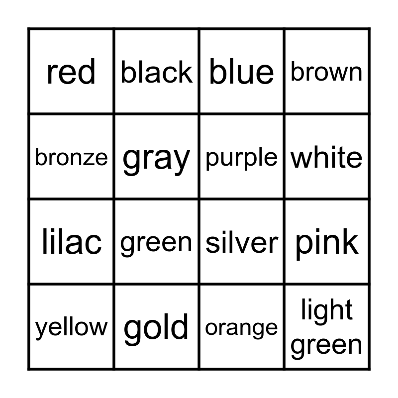 This bingo card has 17 words: orange, yellow, blue, red, green, brown, pink, purple, white, gray, gold, silver, bronze, black, lilac, baby blue and light green.