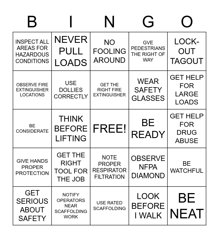 This bingo card has a free space and 74 words: BE FOCUSED, I AM RESPONSIBLE, NO FOOLING AROUND, GET SAFETY SKILLS, OBEY SAFETY RULES, BE PREPARED, TAKE TIME AND CARE, NOTE DANGEROUS CONDITIONS, GET SERIOUS ABOUT SAFETY, OBSERVE EMERGENCY PROCEDURES, BE ALERT, KNOW THE FIRE TRIANGLE, GET THE RIGHT FIRE EXTINGUISHER, OBSERVE FIRE EXTINGUISHER LOCATIONS, BE HELPFUL, THINK BEFORE LIFTING, NEVER LIFT WITH THE BACK, GET HELP FOR LARGE LOADS, OFFER HELP WITH AWKWARD LOADS, BE CONSIDERATE, USE DOLLIES CORRECTLY, NEVER PULL LOADS, GVE PEDESTRIANS THE RIGHT OF WAY, OPERATE FORKLIFTS IN CAPACITY, BE NEAT, CHECK ELECTRICAL CORDS BEFORE PROCEEDING, NEVER MODIFY OR REMOVE GUARDS, GET CPR TRAINING, OBEY ELECTRICAL SAFE CLEARANCES, BE SAFE, LOCK-OUT TAGOUT, NEVER OPERATE DURING LOCKOUT, GIVE NOTICE WHEN MACHINES ARE BACK IN USE, ORDERLY LOCK OUT HAZARDOUS ENERGY, BE OBSERVANT, LOOK BEFORE I WALK, NEVER STAND ON TOP LADDER RUNG, GET HELP TO SUPPORT LADDER BASE, OBEY 4-TO-1 LADDER RULE, BE SURE, USE RATED SCAFFOLDING, NOTIFY OPERATORS NEAR SCAFFOLDING WORK, GUARD AGANST MACHINE INJURIES, OBSERVE PINCH POINTS, BE GUARDED, INSPECT ALL AREAS FOR HAZARDOUS CONDITIONS, NEVER TEST A CUTTING EDGE WITH FINGERS, GET THE RIGHT TOOL FOR THE JOB, ONLY USE A TOOL YOU ARE TRAINED TO USE, BE AWARE, WEAR SEAT BELTS, NEVER DRINK ON THE JOB, GET HELP FOR DRUG ABUSE, OBEY SAFE DRIVING RULES, BE PROTECTIVE, KNOW RESPIRATORY HAZARDS, NOTE PROPER RESPIRATOR FILTRATION, GET CORRECT HEARING PROTECTION, OBSERVE COMMON EYE HAZARDS, BE WATCHFUL, WEAR SAFETY GLASSES, NEVER TAKE SHORTCUTS, GIVE HANDS PROPER PROTECTION, OBEY ALL MSDS/LABELS, BE READY, PROTECT AGAINST CHEMICAL HAZARDS, NEVER USE UNLABELED CONTAINERS, GUARD AGAINST SPARKS & FLAMES, OBSERVE NFPA DIAMOND, BE FLEXIBLE, PREVENT REPETITIVE STRAINS, NOTICE SIGNS OF CARPAL TUNNEL, GIVE HANDS A BREAK FROM REPETITION and OBSERVE PAINS FROM REPETITIVE MOTION.