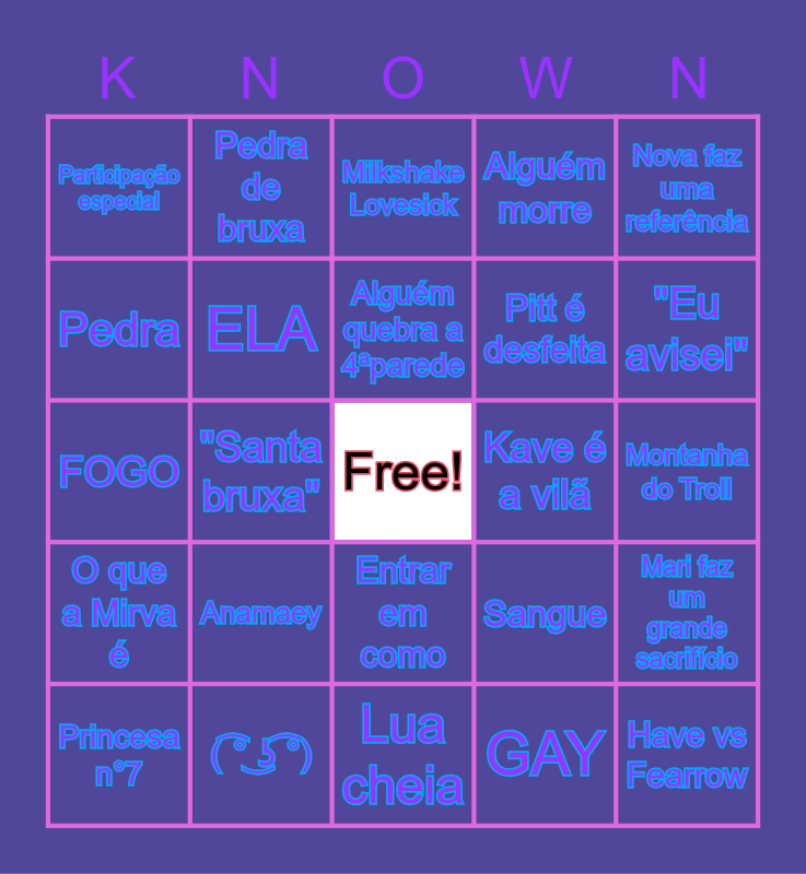 This bingo card has a free space and 24 words: Anamaey, ( ͡° ͜ʖ ͡°), Alguém quebra a 4ªparede, Princesa n°7, Nova faz uma referência, Participação especial, Pedra, Pedra de bruxa, Kave é a vilã, Entrar em como, Pitt é desfeita, FOGO, Sangue, Mari faz um grande sacrifício, ELA, GAY, Montanha do Troll, Milkshake Lovesick, "Eu avisei", "Santa bruxa", Have vs Fearrow, O que a Mirva é, Alguém morre and Lua cheia.