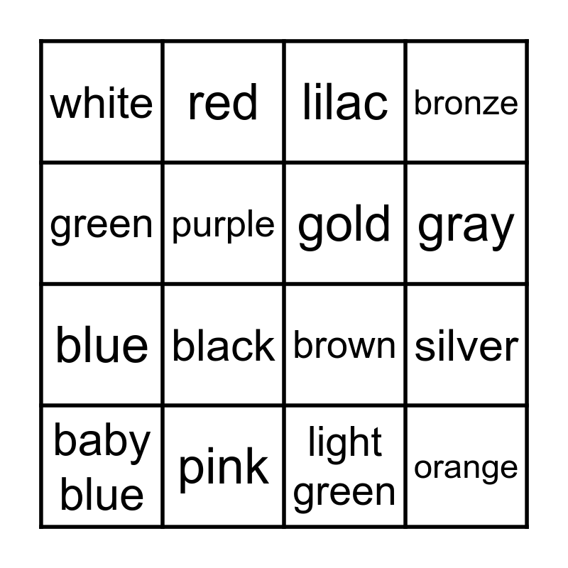 This bingo card has 17 words: light green, baby blue, lilac, white, black, bronze, silver, gold, gray, purple, pink, brown, green, red, blue, yellow and orange.