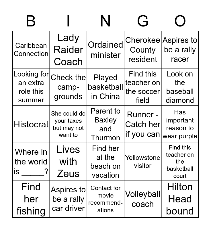 This bingo card has a free space and 24 words: Lives with Zeus, Aspires to be a rally car driver, Played basketball in China, Find her fishing, Aspires to be a rally racer, Caribbean Connection, Looking for an extra role this summer, Lady Raider Coach, Runner - Catch her if you can, Find her at the beach on vacation, Find this teacher on the soccer field, Histocrat, Yellowstone visitor, Find this teacher on the basketball court, Check the camp- grounds, Volleyball coach, Has important reason to wear purple, Ordained minister, Look on the baseball diamond, She could do your taxes but may not want to, Hilton Head bound, Where in the world is _____?, Cherokee County resident and Contact for movie recommend-ations.