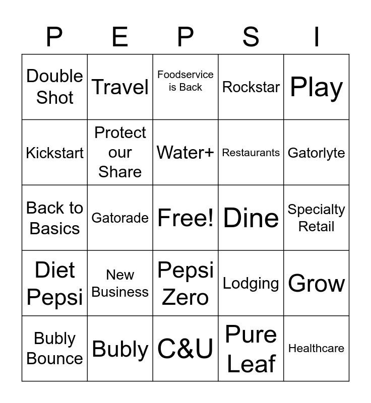 This bingo card has a free space and 54 words: Pepsi, Diet Pepsi, Mt Dew, Cherry Pepsi, Pepsi Zero, Major Melon, Rockstar, Rise, Kickstart, Bang, Double Shot, Triple Shot, Bubly, Bubly Bounce, Spark, C&U, Healthcare, Restaurants, Golf, Specialty Retail, Lodging, Work, Dine, Play, Shop, Travel, Frappuccino, Cold Brew, Lipton Iced Tea, Pure Leaf, 14% NR Growth, Dig In, Expand B&C, Innovation, Foodservice is Back, Restart, Back to Basics, Grow, Renewals, Protect our Share, Digital, Sustainability, Portfolio, Win, New Business, Unlock PDP, Prospecting, Insights, Water+, Gatorade, Gatorlyte, Baya, Mt Dew Zero and Chilled.