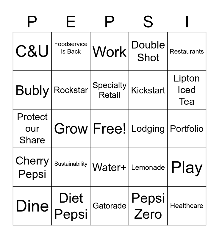 This bingo card has a free space and 59 words: Pepsi, Diet Pepsi, Mt Dew, Cherry Pepsi, Pepsi Zero, Major Melon, Rockstar, Rise, Kickstart, Bang, Double Shot, Triple Shot, Bubly, Bubly Bounce, Spark, C&U, Healthcare, Restaurants, Golf, Specialty Retail, Lodging, Work, Dine, Play, Shop, Travel, Frappuccino, Cold Brew, Lipton Iced Tea, Pure Leaf, 14% NR Growth, Dig In, Expand B&C, Innovation, Foodservice is Back, Restart, Back to Basics, Grow, Renewals, Protect our Share, Digital, Sustainability, Portfolio, Win, New Business, Unlock PDP, Prospecting, Insights, Water+, Gatorade, Gatorlyte, Baya, Mt Dew Zero, Chilled, Nitro Pepsi, Lemonade, Juice+, VAP and Propel.