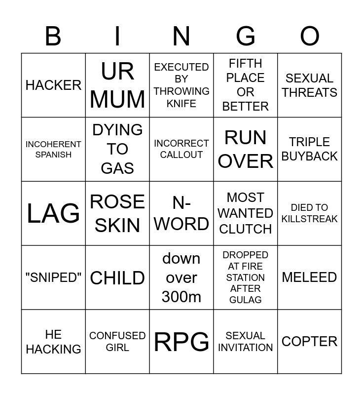 This bingo card has a free space and 24 words: CHILD, CONFUSED GIRL, INCORRECT CALLOUT, HE HACKING, SEXUAL THREATS, HACKER, INCOHERENT SPANISH, UR MUM, MOST WANTED CLUTCH, down over 300m, RUN OVER, LAG, DROPPED AT FIRE STATION AFTER GULAG, MELEED, DYING TO GAS, SEXUAL INVITATION, DIED TO KILLSTREAK, EXECUTED BY THROWING KNIFE, TRIPLE BUYBACK, ROSE SKIN, COPTER, "SNIPED", FIFTH PLACE OR BETTER and RPG.