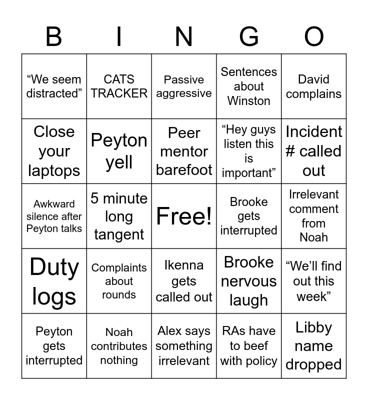 This bingo card has a free space and 24 words: Peyton gets interrupted, Complaints about rounds, Peer mentor barefoot, RAs have to beef with policy, David complains, “We seem distracted”, CATS TRACKER, Passive aggressive, Brooke gets interrupted, Irrelevant comment from Noah, Awkward silence after Peyton talks, Peyton yell, Brooke nervous laugh, “We’ll find out this week”, Close your laptops, Noah contributes nothing, Alex says something irrelevant, Sentences about Winston, Incident # called out, Duty logs, 5 minute long tangent, Ikenna gets called out, “Hey guys listen this is important” and Libby name dropped.