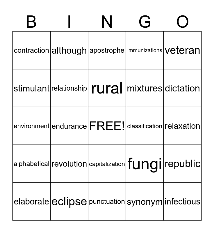 This bingo card has a free space and 37 words: peninsula, political, range, relationship, republic, revolution, rural, taxation, veteran, depressant, endurance, immunizations, infectious, relaxation, stimulant, alphabetical, antonym, apostrophe, capitalization, classification, contraction, dictation, elaborate, punctuation, syllables, synonym, although, among, vineyard, bacteria, decomposes, eclipse, environment, evaporation, fungi, mixtures and organism.