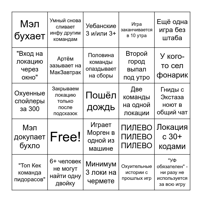 This bingo card has 25 words: Free!, Минимум 3 локи на чермете, Половина команды опаздывает на сборы, "Топ Кек команда пидорасов", Ещё одна игра без штаба, Мэл бухает, "Вход на локацию через окно", Умный снова сливает инфу другим командам, Две команды на одной локации, Играет Морген в одной из машине, Второй город выпал под утро, Охуенные спойлеры за 300, ПИЛЕВО ПИЛЕВО ПИЛЕВО, Локация с 30+ кодами, Артём зазывает на МакЗавтрак, "УФ обязателен" - ни разу не используется за всю игру, Гниды с Экстаза ноют в общий чат, Уебанские 3 и/или 3+, У кого-то сел фонарик, Закрываем локацию только после подсказок, Пошёл дождь, 6+ человек не могут найти одну двойку, Мэл докупает бухло, Игра заканчивается в 10 утра and Охуительные истории с прошлых игр.