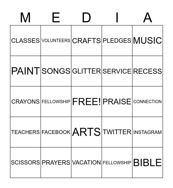 This bingo card has a free space and 29 words: SCISSORS, REFRESHMENTS, FELLOWSHIP, STUDY, CLASSES, CRAFTS, SONGS, FACEBOOK, PRAISE, PRAYERS, CONNECTION, BIBLE, VACATION, FELLOWSHIP, RECESS, WORSHIP, ARTS, TEACHERS, MUSIC, CRAYONS, TWITTER, GLUE, SERVICE, PAINT, PLEDGES, VOLUNTEERS, INSTAGRAM, GLITTER and FLAGS.