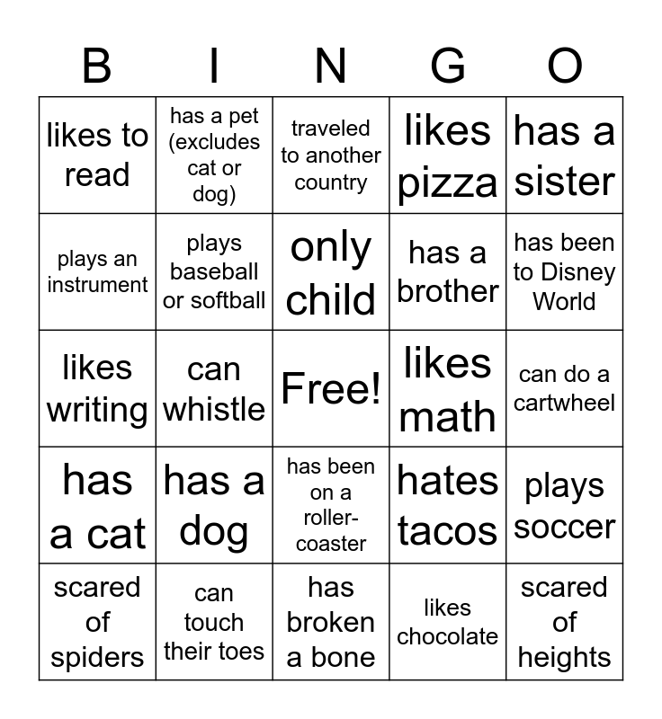 This bingo card has a free space and 24 words: has a dog, can touch their toes, only child, scared of spiders, has a sister, likes to read, plays an instrument, has a pet (excludes cat or dog), likes math, has been on a roller- coaster, has a brother, likes writing, hates tacos, plays soccer, plays baseball or softball, likes chocolate, can do a cartwheel, traveled to another country, has been to Disney World, can whistle, scared of heights, has a cat, likes pizza and has broken a bone.