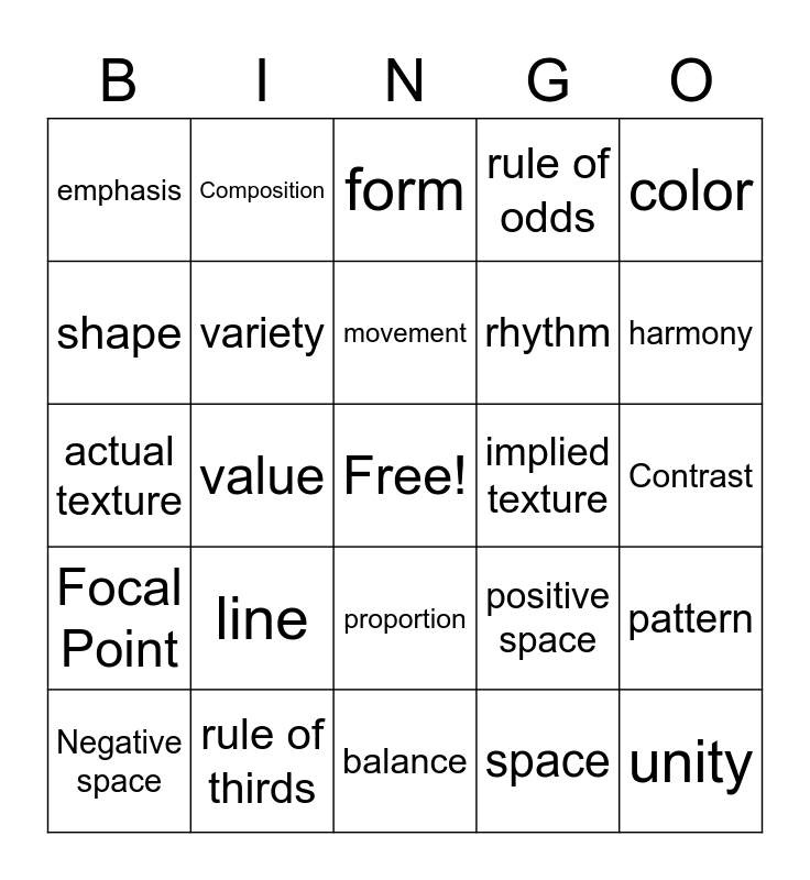 This bingo card has a free space and 24 words: line, rule of thirds, movement, Negative space, color, emphasis, shape, Composition, implied texture, proportion, rhythm, actual texture, positive space, pattern, variety, space, Contrast, form, harmony, value, unity, Focal Point, rule of odds and balance.