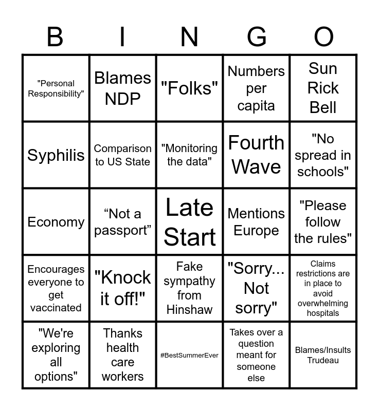 This bingo card has a free space and 45 words: Vapid talking points, Blames/Insults Trudeau, Pats self on back for $100 gift cards, "We're exploring all options", Rejects the premise of something, Takes over a question meant for someone else, "Folks", "Let me be clear", Sun Rick Bell, Thanks health care workers, Numbers per capita, Mentions Europe, Fake sympathy from Hinshaw, "Knock it off!", Evasive answer, #BestSummerEver, Lies or Gaslights, Economy, Blames healthcare workers, "No spread in schools", Blames NDP, Rewards Anti-Vaxxers, Refuses aid, "Personal Responsibility", "Bend the curve", "Please follow the rules", Kenney boasts about Alberta, Deeply regrets reopening, "Sorry... Not sorry", Encourages everyone to get vaccinated, Blames Albertans for spike, Claims restrictions are in place to avoid overwhelming hospitals, Smirks, Social media footsoldiers/angry people on twitter, “Let me just pause to say…”, “Not a passport”, "Kids have less severe outcomes", Fear-mongering, Concerned, "Monitoring the data", Syphilis, Fourth Wave, Made in Alberta solution, Comparison to US State and Plateaued.