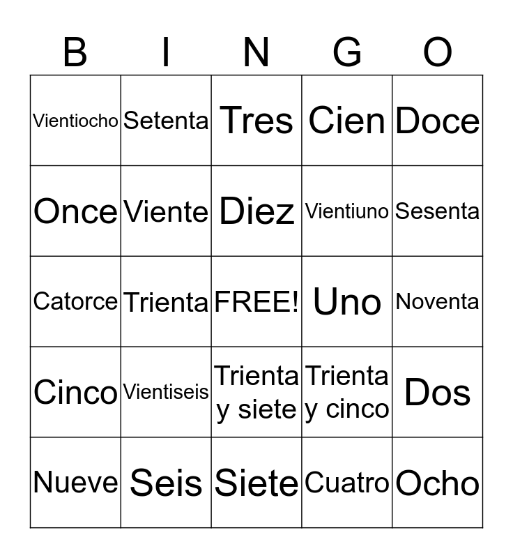 This bingo card has a free space and 24 words: Vientiseis, Seis, Diez, Nueve, Doce, Vientiocho, Once, Setenta, Uno, Trienta y siete, Vientiuno, Catorce, Trienta y cinco, Dos, Viente, Cuatro, Noventa, Tres, Sesenta, Trienta, Ocho, Cinco, Cien and Siete.