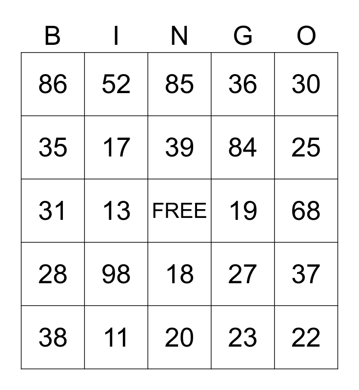 This bingo card has a free space and 30 words: 11, 46, 13, 54, 86, 85, 17, 18, 19, 20, 68, 22, 23, 79, 25, 73, 27, 28, 98, 30, 31, 93, 52, 84, 35, 36, 37, 38, 39 and 40.