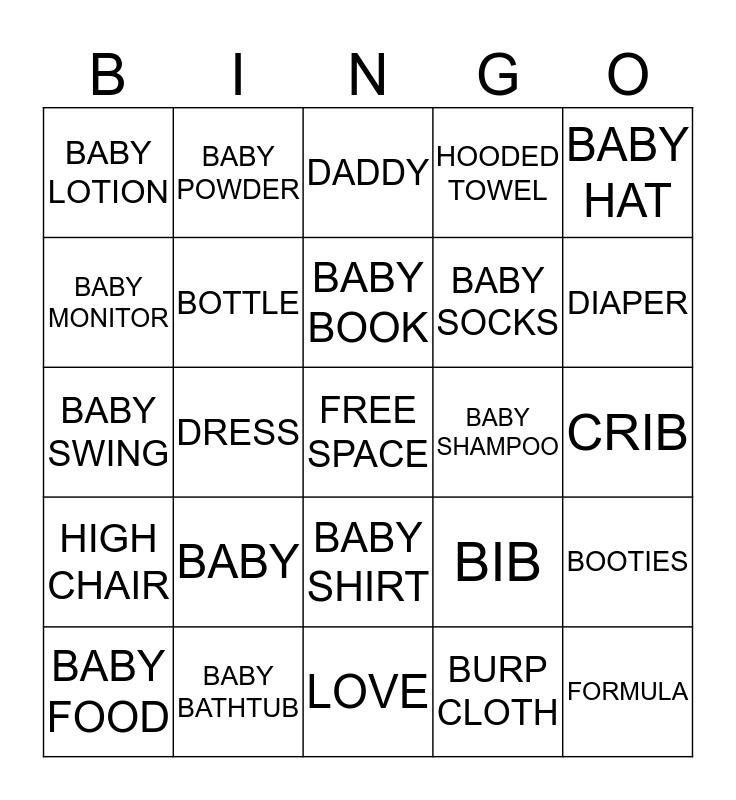This bingo card has a free space and 24 words: BABY, BABY BATHTUB, BABY BOOK, BABY FOOD, BABY HAT, BABY LOTION, BABY MONITOR, BABY POWDER, BABY SHAMPOO, BABY SHIRT, BABY SOCKS, BABY SWING, BIB, BOOTIES, BOTTLE, BURP CLOTH, CRIB, DADDY, DIAPER, DRESS, FORMULA, HIGH CHAIR, HOODED TOWEL and LOVE.