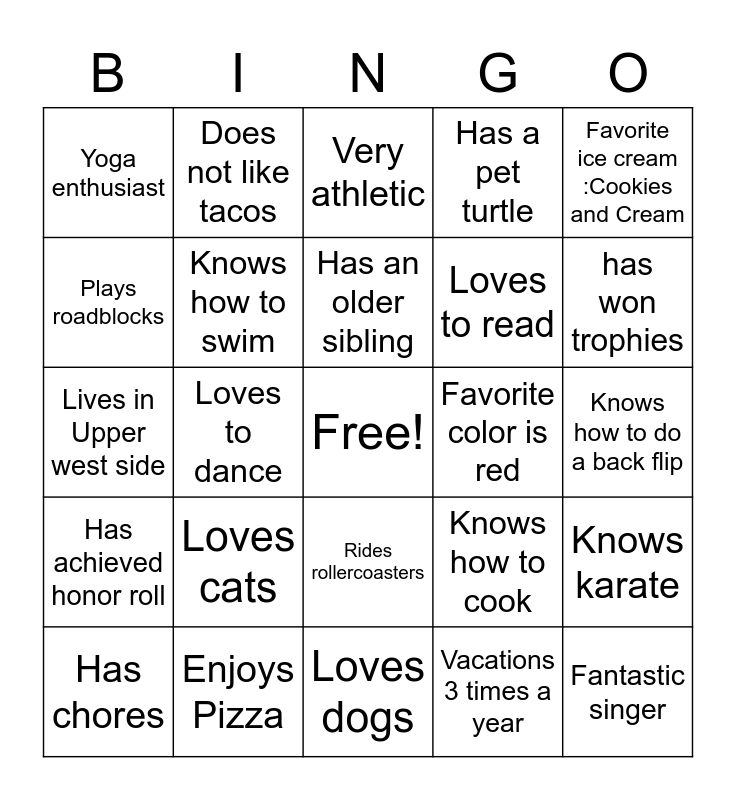 This bingo card has a free space and 24 words: Loves cats, Enjoys Pizza, Has an older sibling, Has chores, Favorite ice cream :Cookies and Cream, Yoga enthusiast, Plays roadblocks, Does not like tacos, Favorite color is red, Rides rollercoasters, Loves to read, Lives in Upper west side, Knows how to cook, Knows karate, Knows how to swim, Vacations 3 times a year, Knows how to do a back flip, Very athletic, has won trophies, Loves to dance, Fantastic singer, Has achieved honor roll, Has a pet turtle and Loves dogs.