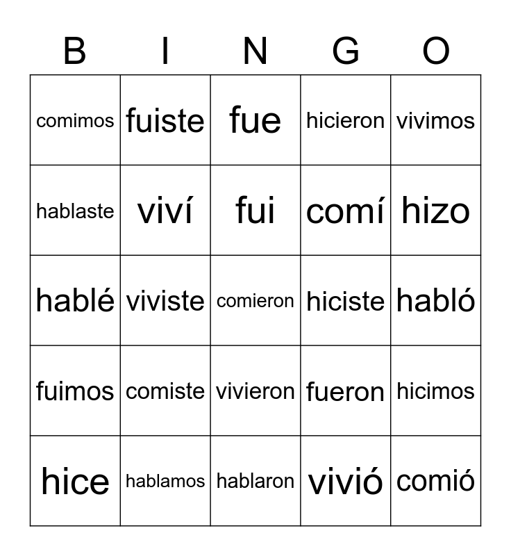 This bingo card has 25 words: comiste, hablaron, fui, hice, vivimos, comimos, hablaste, fuiste, hiciste, vivieron, comí, hablé, fueron, hicimos, viví, comió, habló, fue, hizo, viviste, comieron, hablamos, fuimos, hicieron and vivió.
