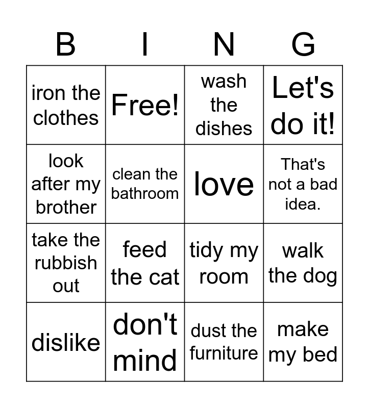 This bingo card has 19 words: tidy my room, vacuum the carpet, wash the dishes, make my bed, walk the dog, look after my brother, dust the furniture, iron the clothes, Free!, take the rubbish out, feed the cat, clean the bathroom, love, don't mind, dislike, hate, Let's do it!, That's not a bad idea. and I don't mind it..